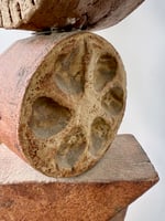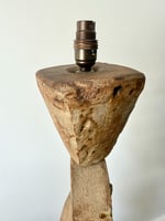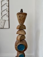 A beautiful sculptural piece, made up of ceramic elements in natural tones of terracotta and stone, with lots of texture, built over a metal tube. The two round elements are decorated on one side with blue/green glass, and a wheel or seed pod motif on the reverse. Very unusual now to see these lamps with glass decoration.