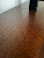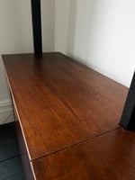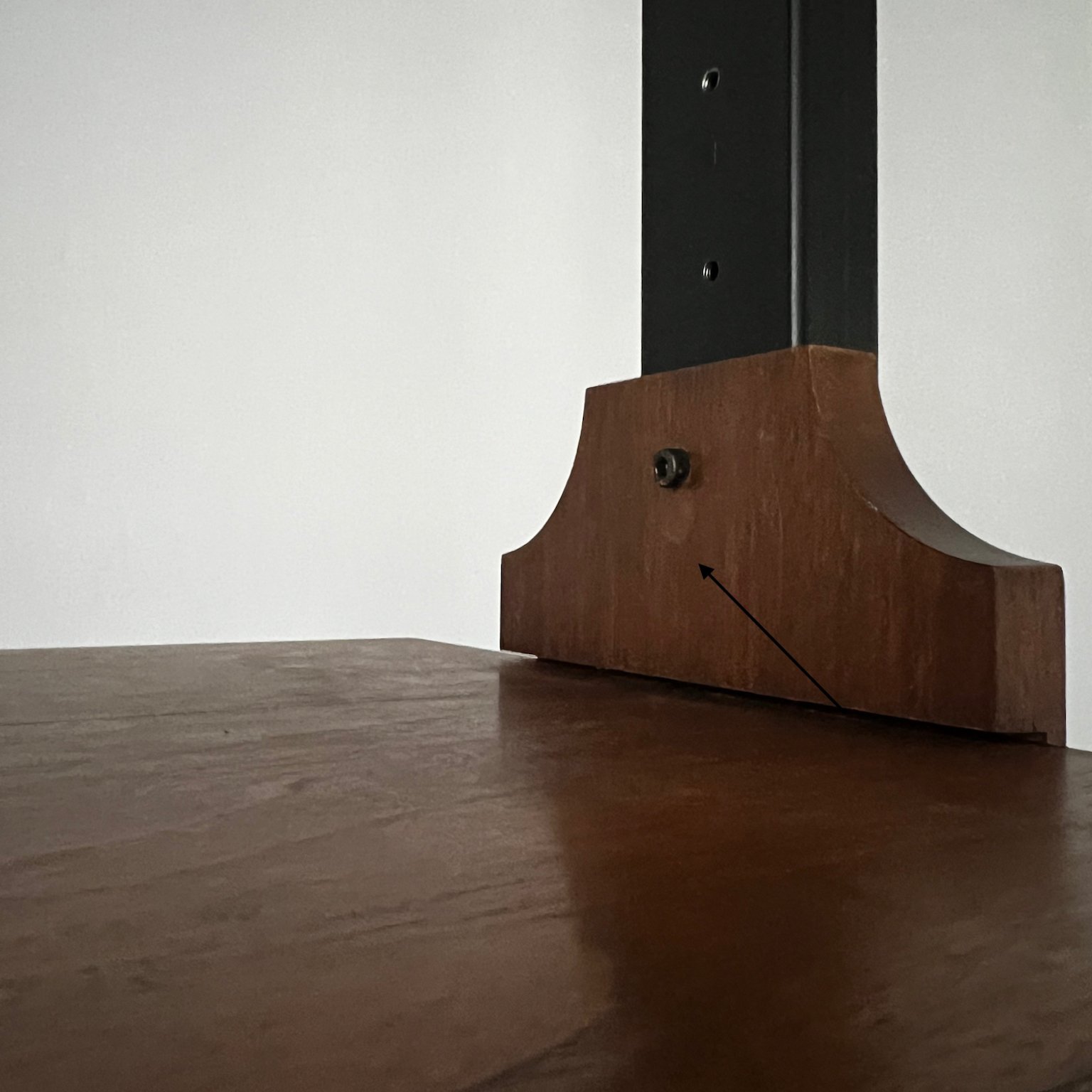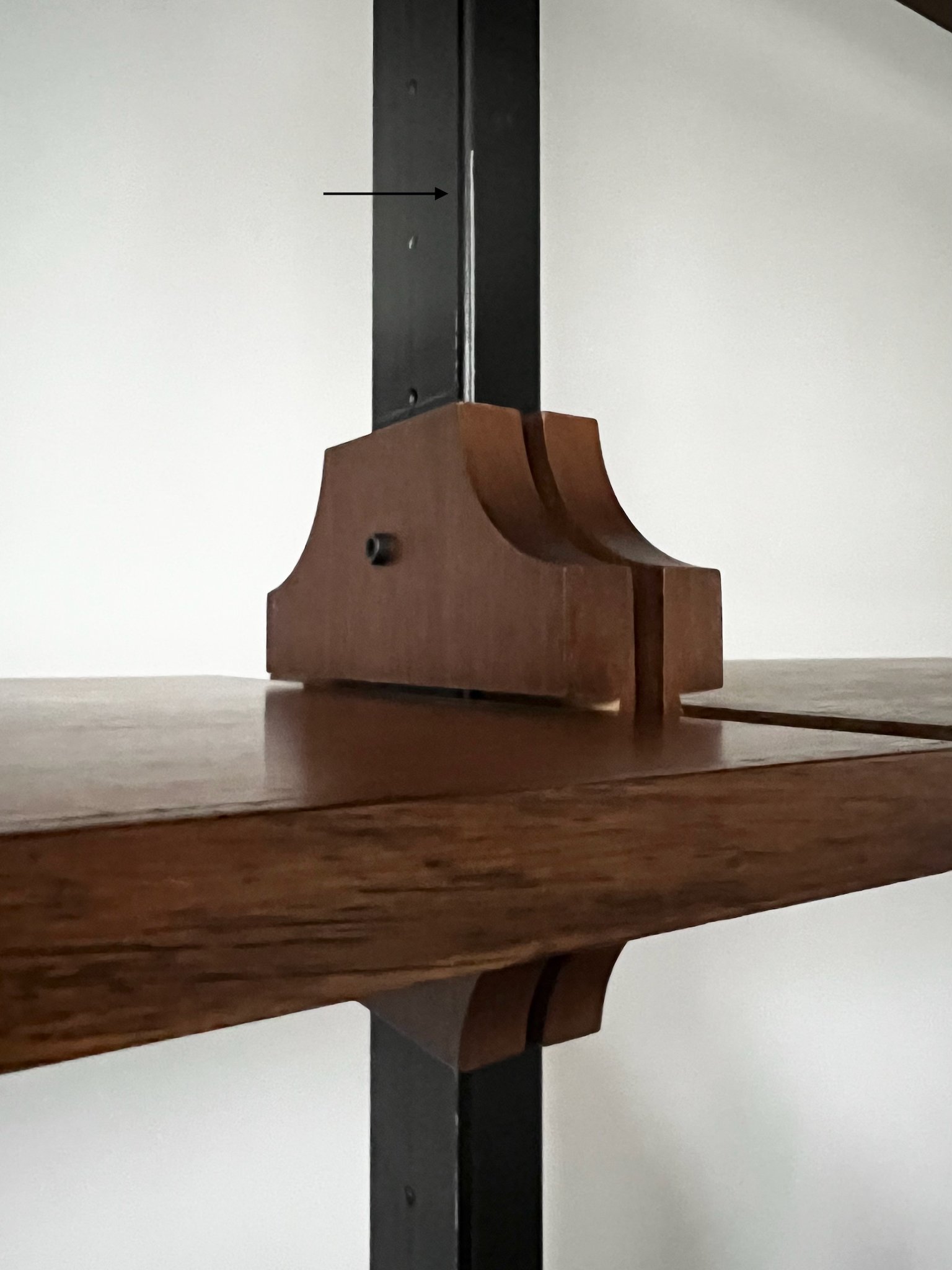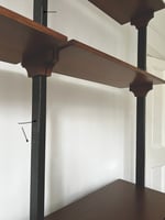 The shelving unit is made up of separate components made of wood, finished in walnut, with black metal uprights running between the floor and ceiling. The cupboards sit at the lowest point, while the shelves can be positioned according to your needs. The cupboards are veneered to all sides except the back; shelves are veneered to all sides.