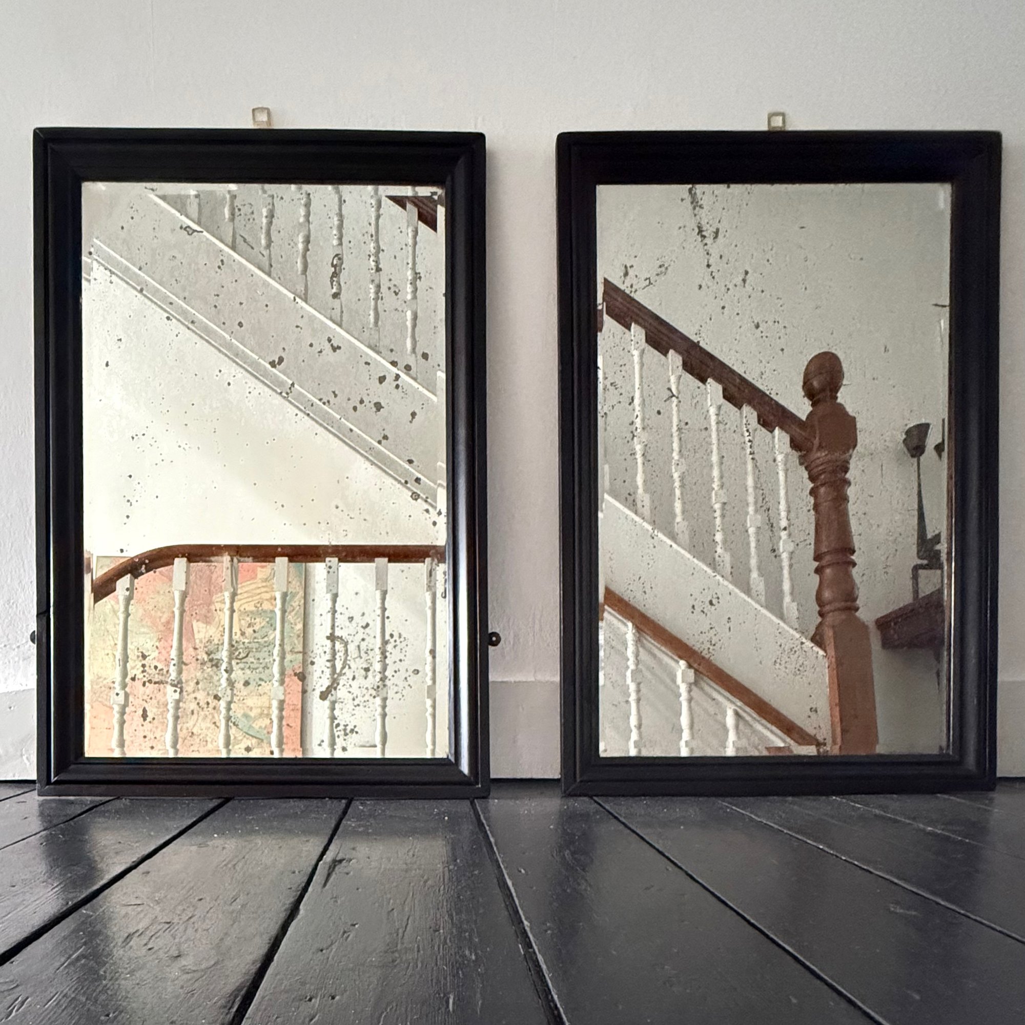 Lots of wear to the glass including some losses to the mirror backing and other marks. The wooden frames have been painted with black shellac - also with some losses - and the mirror glass is very slightly loose its housing.